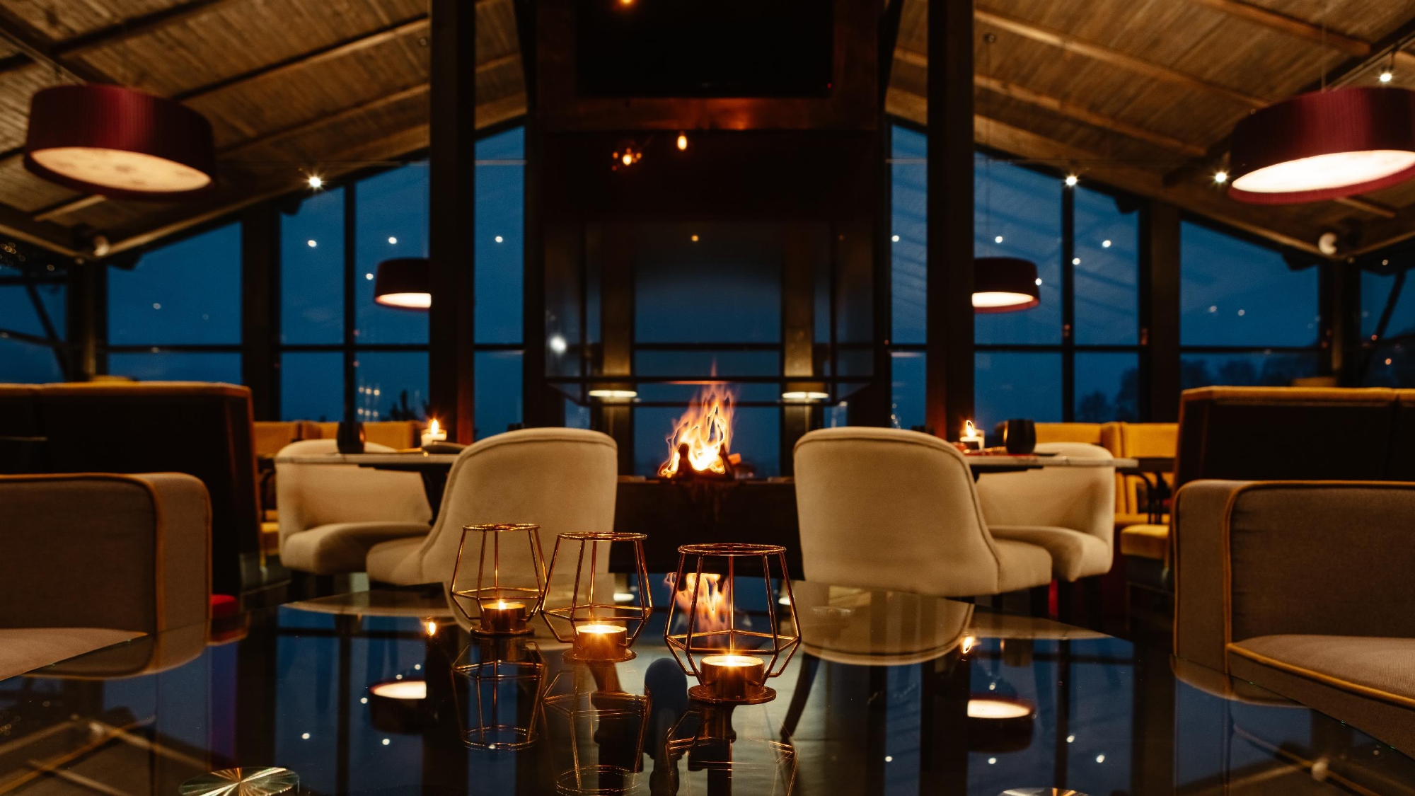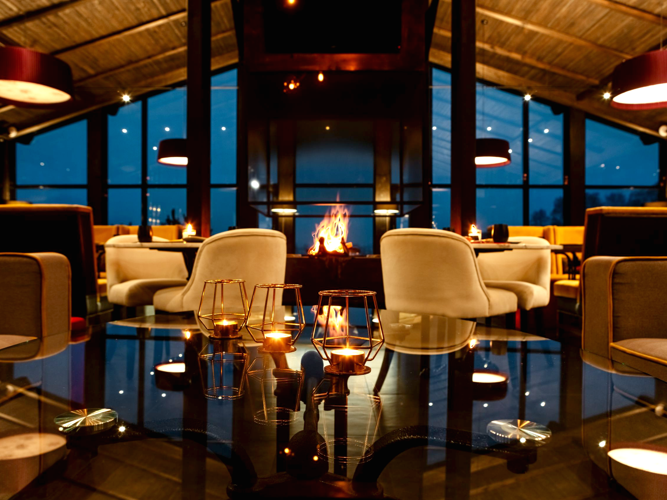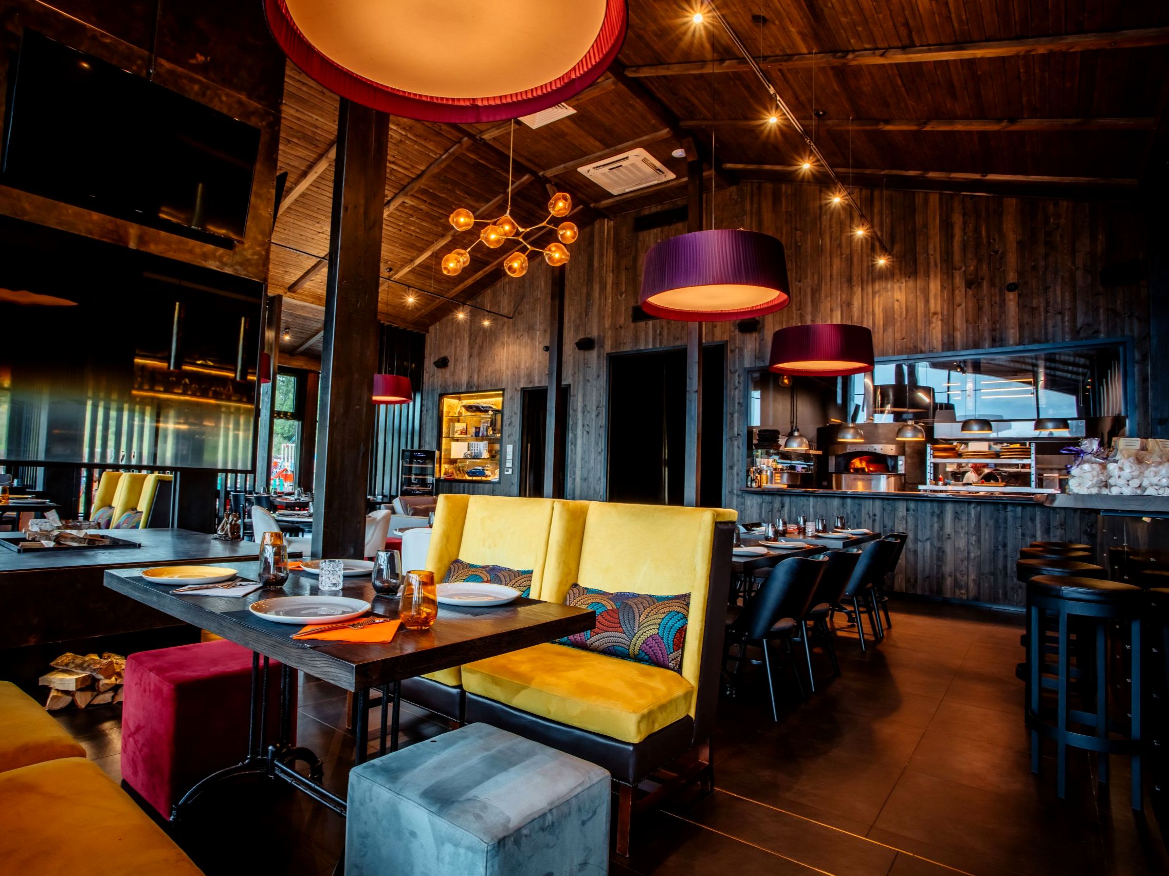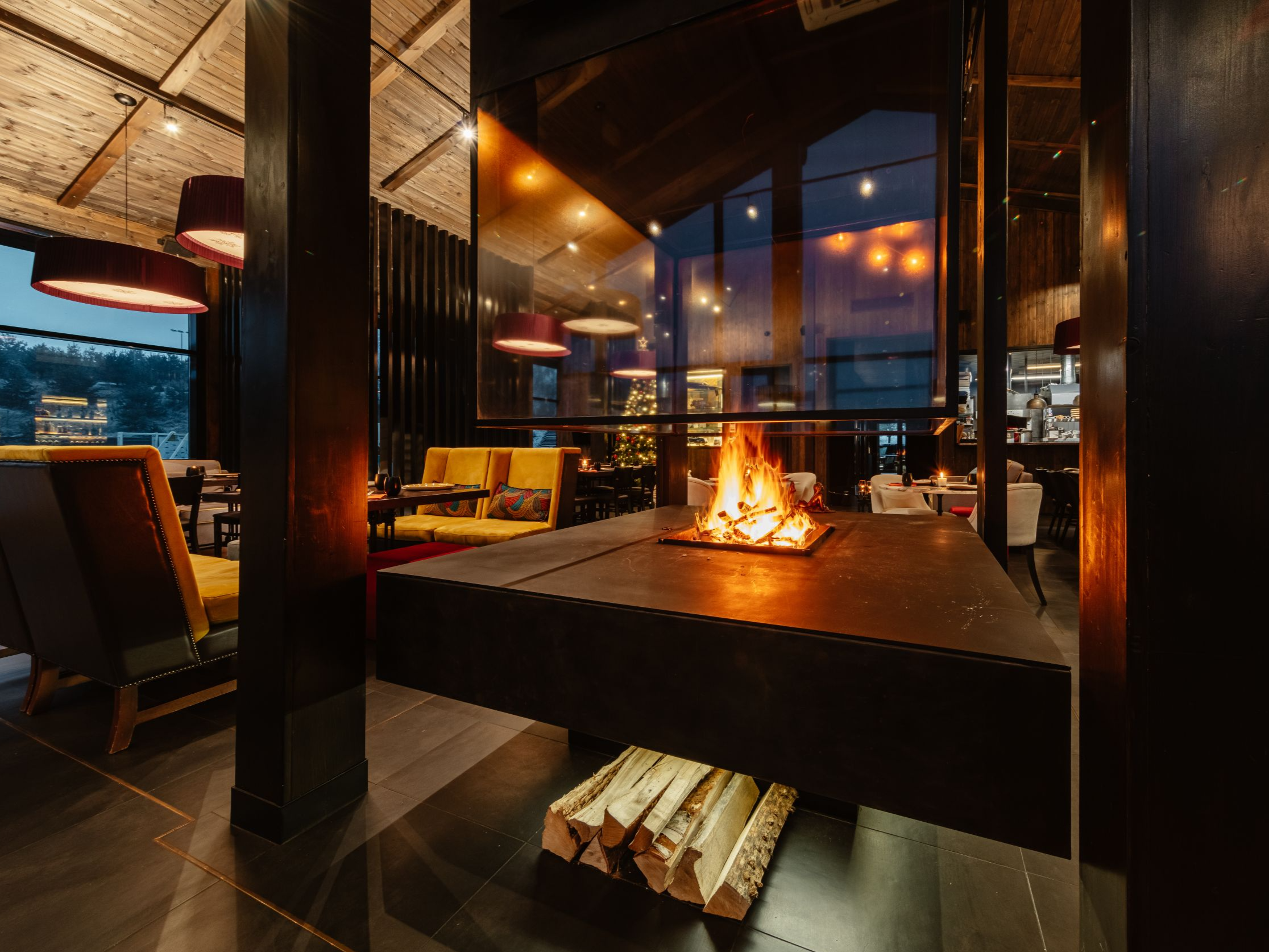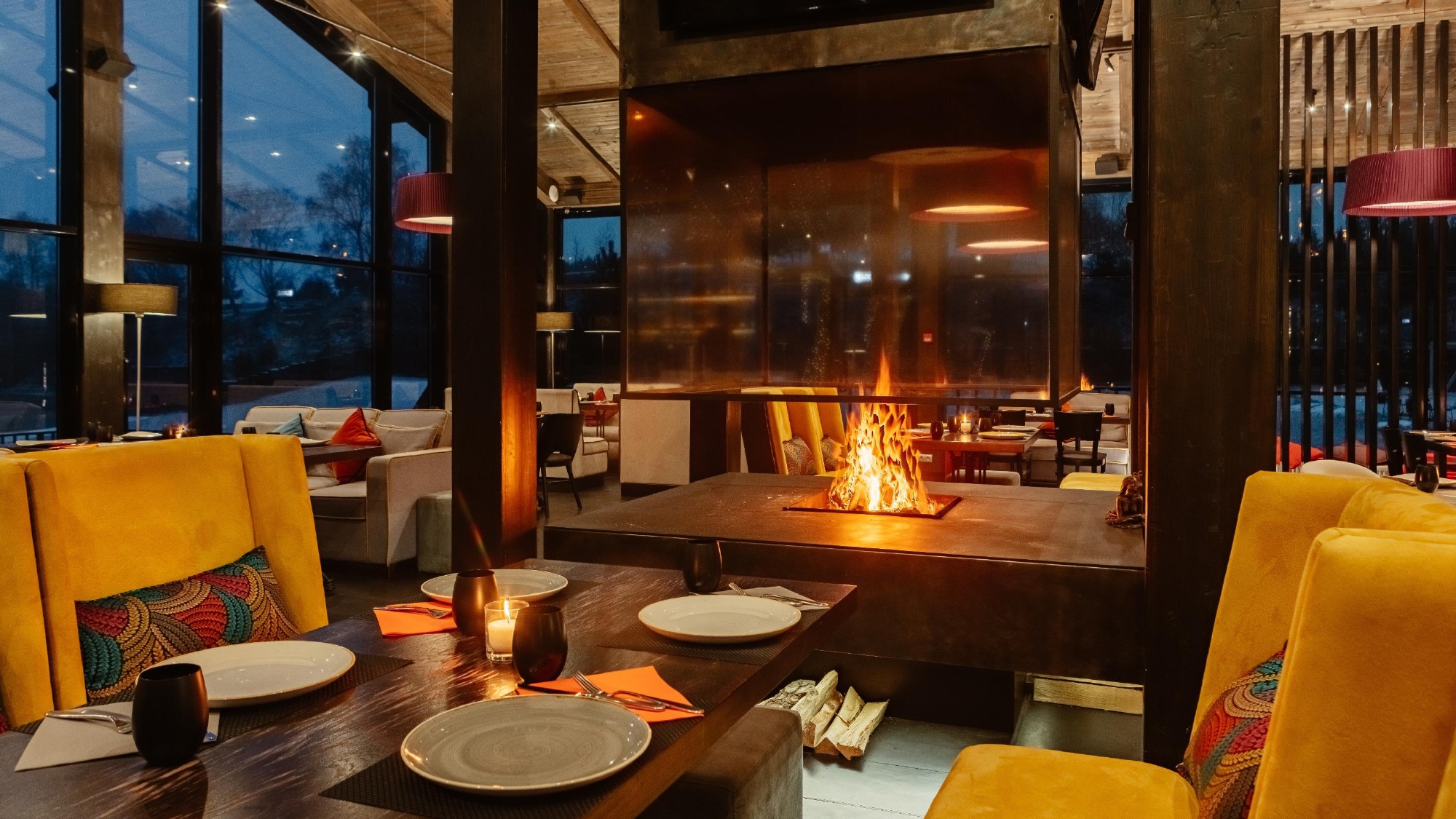 Дизайн заведения выполнен в дереве насыщенных темных тонов и дополнен яркими акцентами, а в центре зала расположен камин с жарким огнем - сердцем нашего ресторана.